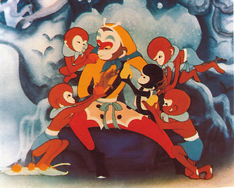 在花果山帶領(lǐng)群猴操練武藝的猴王因無稱心的武器,便去東海龍宮借寶。龍王許諾,如果猴王能拿動(dòng)龍宮的定海神針--如意金箍棒,就奉送給他。但當(dāng)猴王拔走寶物之后,龍王又反悔,并去天宮告狀。玉帝采納了太白金星的主張,誘騙猴王上天,封他為弼馬溫,將他軟禁起來。猴王知道受騙后,一怒之下,返回花果山,豎起"齊天大圣"的旗幟,與天宮分庭抗禮。玉帝發(fā)怒,命李天王率天兵天將捉拿猴王,結(jié)果被猴王打得大敗而歸。玉帝又接受金星的獻(xiàn)策,假意封猴王為"齊天大圣",命他在天宮掌管蟠桃園。一日,猴王得知王母娘娘設(shè)蟠桃宴,請(qǐng)了各路神仙,唯獨(dú)沒有請(qǐng)他。猴王火冒三丈,大鬧瑤池,打得杯盤狼藉,他獨(dú)自開懷痛飲,又吃了太上老君的九轉(zhuǎn)金丹,收羅了所有酒菜瓜果,回花果山與眾猴擺開了神仙酒會(huì)。玉帝暴怒,傾天宮之兵將,捉拿猴王。交戰(zhàn)中猴王中了太上老君的暗算,不幸被擒。老君將他送進(jìn)煉丹爐,結(jié)果不但沒有燒死,反使猴王更加神力無比。于是猴王奮起反擊,把天宮打得落花流水,嚇得玉帝狼狽逃跑。